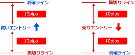僕のトレード戦略の特長の1つは、エントリー後、利益方向に10pipsの幅で「TP(利益確定ライン)」、損失方向に10pipsの幅で「SL(損切りライン)」を設定することです。
