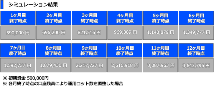 12ヶ月目終了時点で、初期資金50万円が7倍強に膨れ上がるシミュレーション結果となりました。「1日2トレード」「1.5%ルール」のそれほど無理のない「運用指針」で得られる結果としては、上々ではないでしょうか。